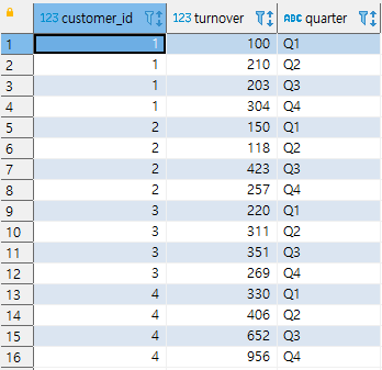 SELECT 1 AS CUSTOMER_ID, 101 AS TURNOVER, 'Q1' AS QUARTER
