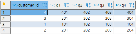 SELECT 1 AS CUSTOMER_ID, 100 AS Q1, 210 AS Q2, 203 AS Q3, 304 AS Q4